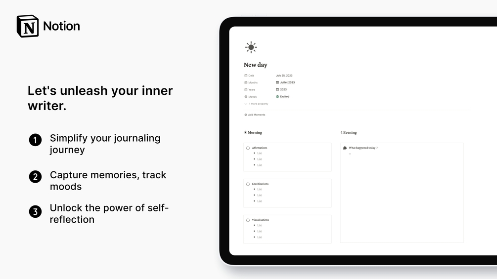 Introducing the Journal template for Notion - your ultimate companion for a fulfilling journaling experience! Say goodbye to the hassle of starting from scratch and let this template simplify your journaling process. With sections dedicated to gratitude, memorable moments, and mood tracking, you'll have everything you need to embark on a transformative journey of self-reflection. So, grab your pen and unleash your inner writer today!